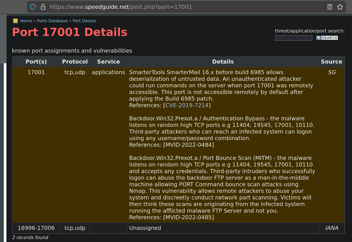 Port 17001 is related to SmarterMail. In the build before 6985, it allows unauthenticated attacker to run commands on the server when port 17001 was remotely accessible.