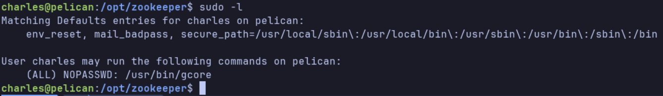 Running sudo -l reveal that user charles may run /usr/bin/gcore with NOPASSWD